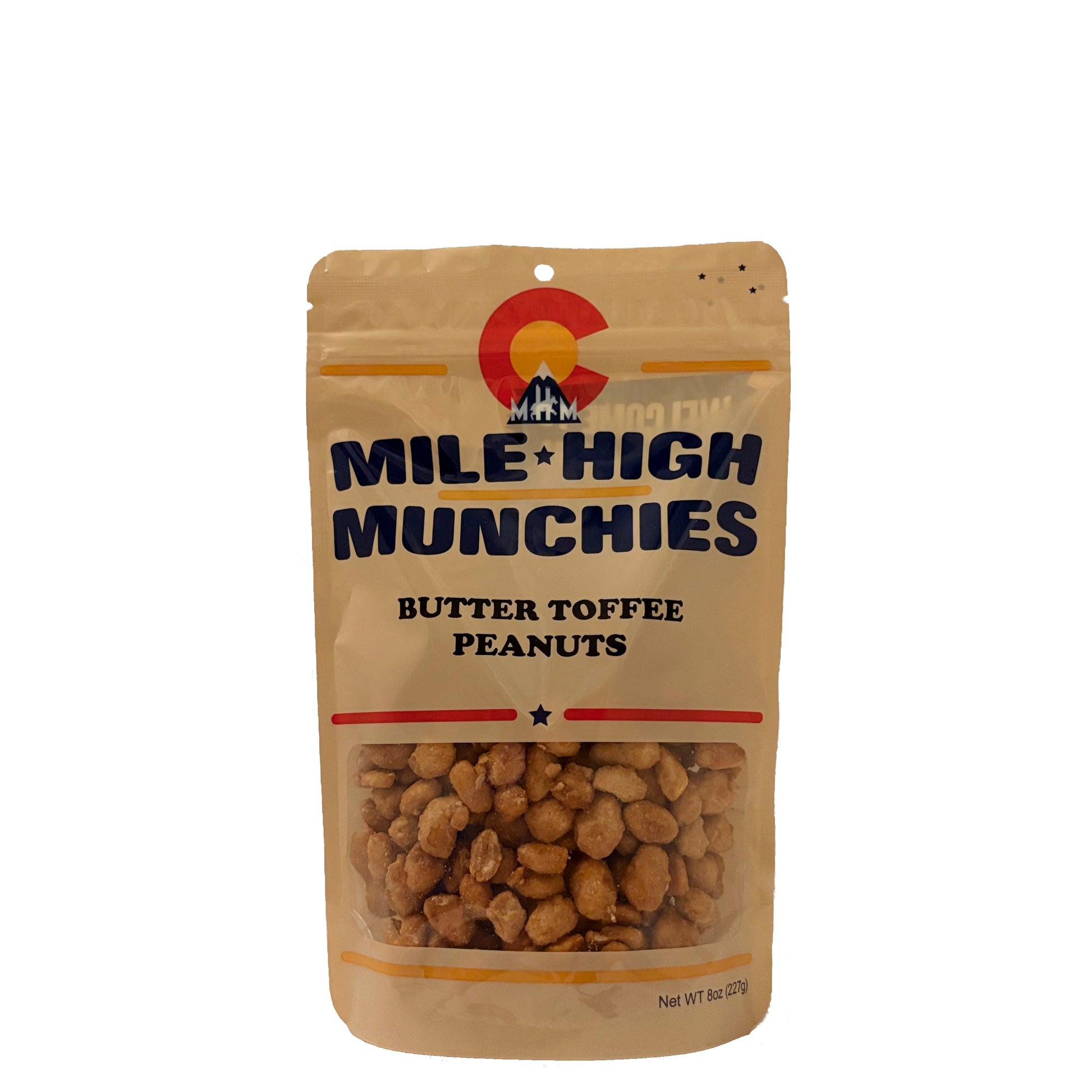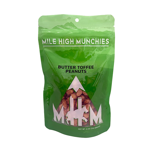 Mile High Munchies’ Butter Toffee Peanuts—a sweet twist on a classic! These peanuts, coated in rich toffee with a hint of sea salt, are perfect for trail snacks or campfire treats.