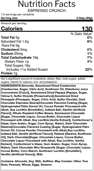 Kick it up a level with Mile High Munchies Espresso Crunch! Almonds mixed with sweet dried cranberries, papaya, and pineapple, dark chocolate-covered raisins, and dark chocolate espresso beans, all add up to one of our favorite Colorado trail mixes and on-the-go snacks. Contains caffeine!